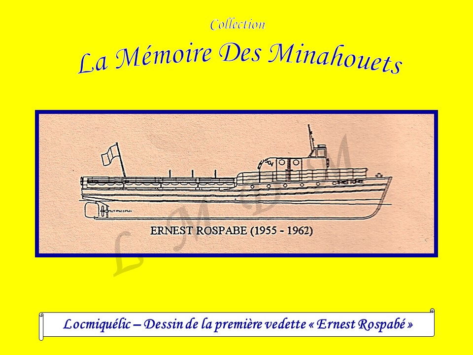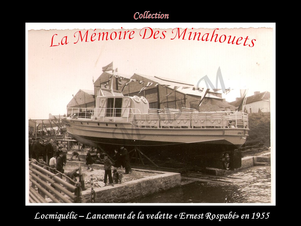 Construite en fer aux chantiers de Pen-mané à locmiquélic (56), la vedette "Ernest Rospabé", du nom d'un membre fondateur, a été lancée le 08 avril 1955 devant une foule impressionnante en présence du Préfet et de diverses autorités départementales.